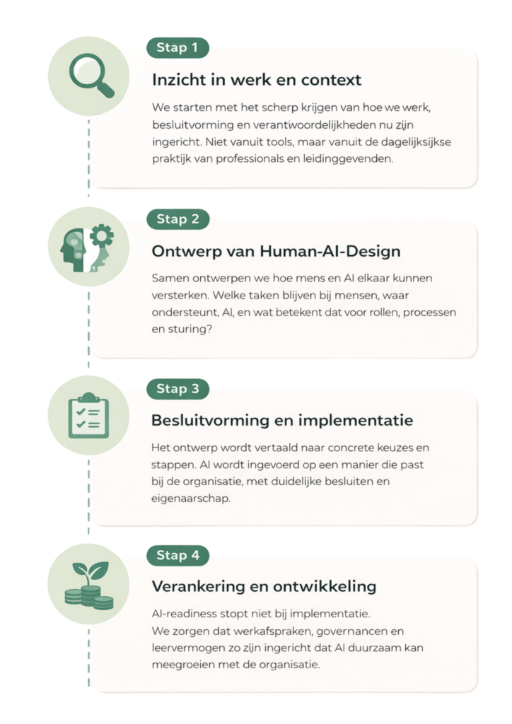 AI-readiness betekent dat een organisatie begrijpt wat AI wel en niet is, waar het waarde kan toevoegen, en wat dit vraagt van gedrag, rollen en verantwoordelijkheden.